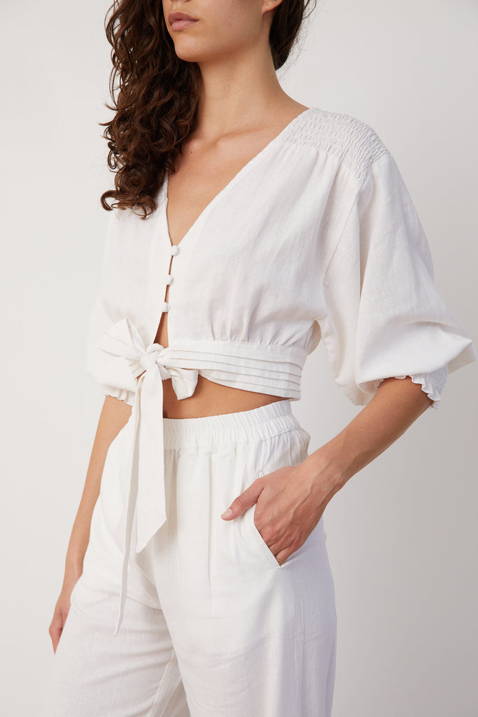 Featuring elasticised frill cuffs detailed sleeves, funtional buttons and front tie detailing.