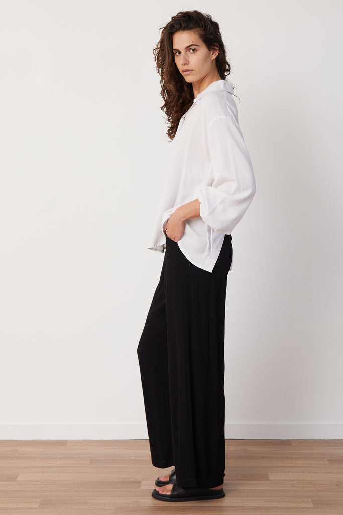 Made from soft linen featuring a flowing and comfortable fit with corded ties at sleeves - with open back tied.