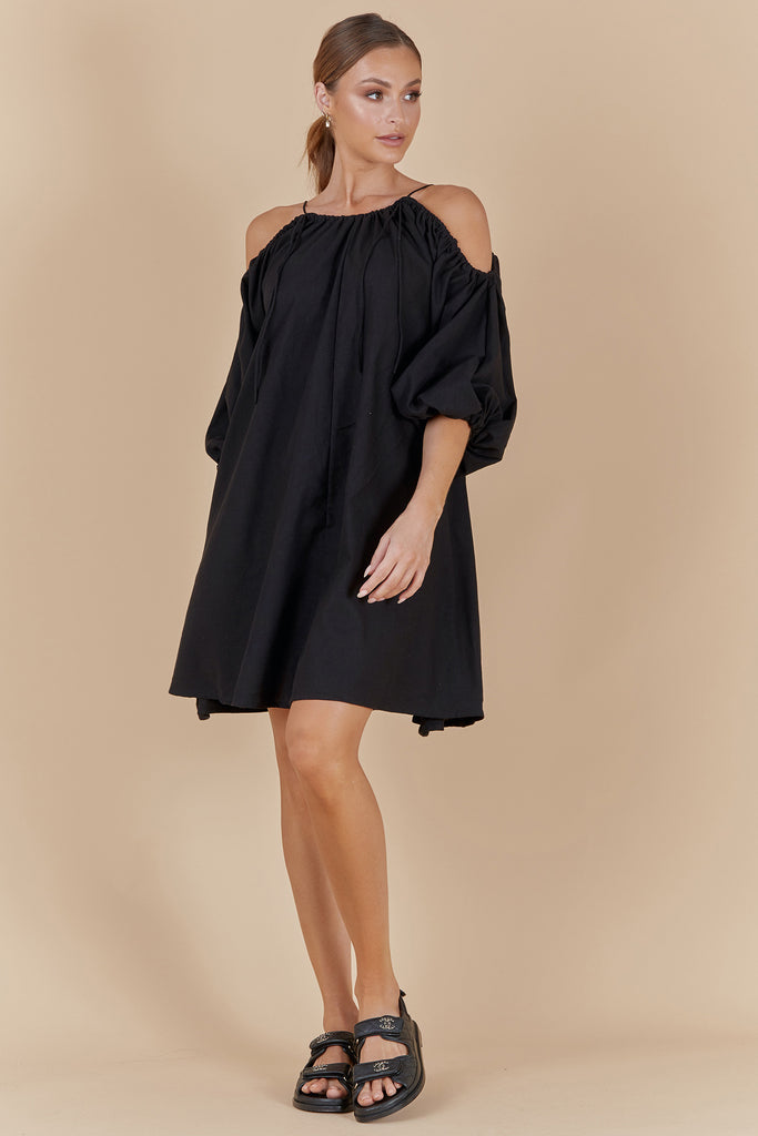 Feminine and relaxed style with a scooped neckline, elastic puff sleeves and a back tied closure.