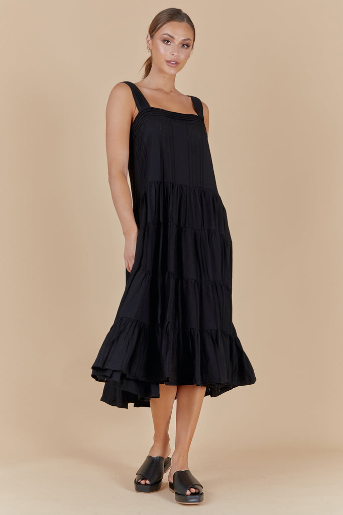 A tiered silhouette dress featuring a square neckline with pleating detail and fabric covered buttons, which can be worn with the button detail at either front or back.