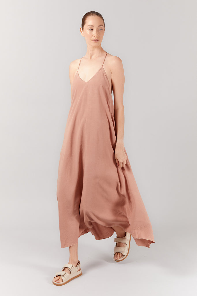 Lightweight and low back dress featuring crisscrossing straps with single button at the back of neck.