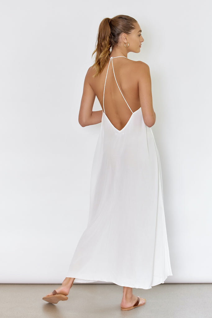 Lightweight and low back dress featuring crisscrossing straps with single button at the back of neck.