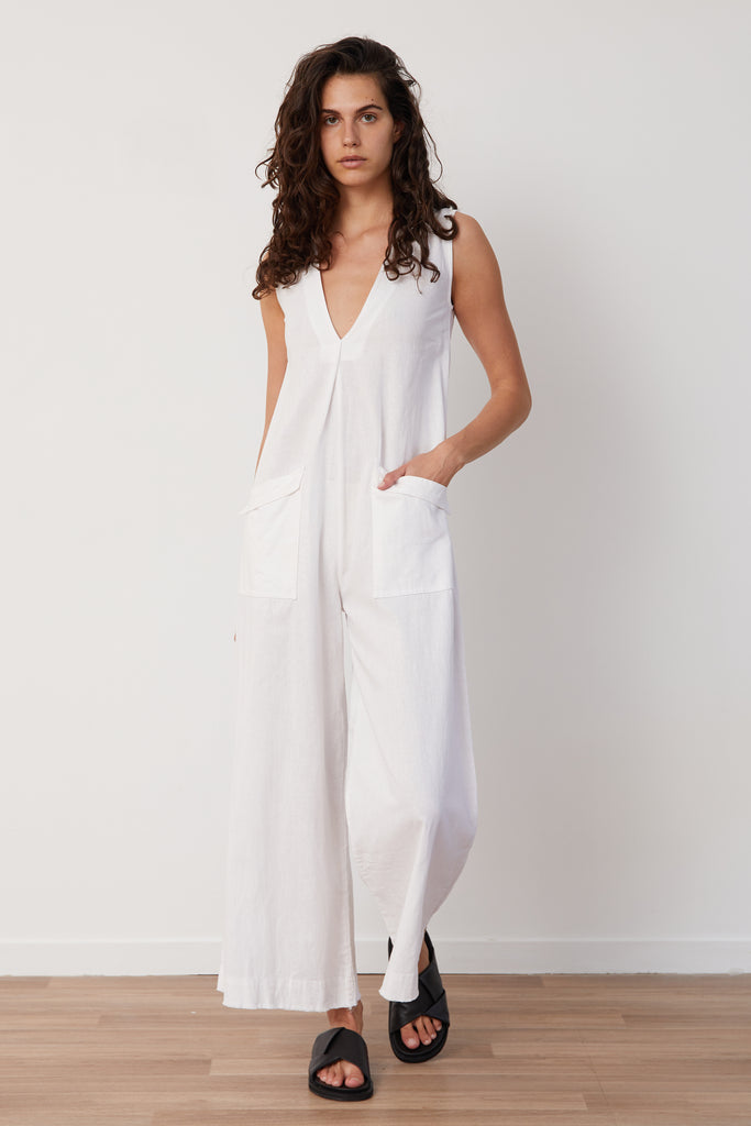 Sleeveless overall with a V neckline featuring a tie self belted waist, front pockets, full length with a raw edge detail and a hidden back zipper closure.