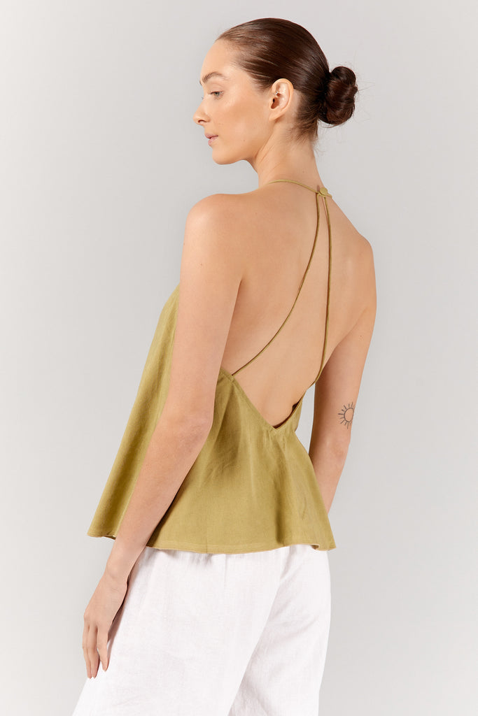 Lightweight and low back top featuring crisscrossing straps with single button at the back of neck.