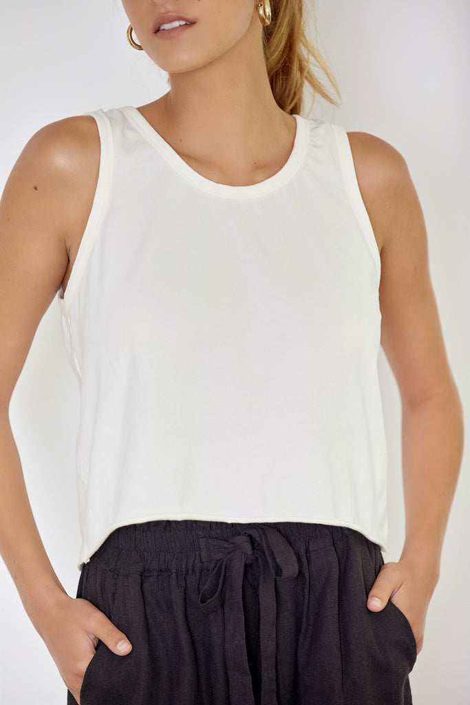 Organic cotton tank featuring a scoop neckline, tie back detail, loose fit and front raw finishing detail.