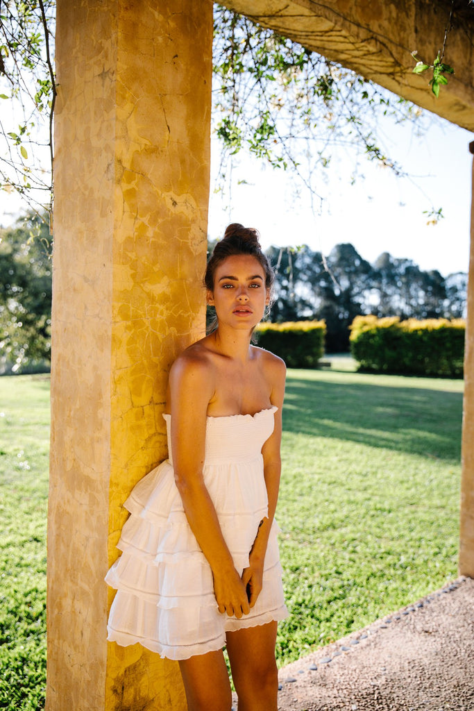 Feminine with a romantic feel, featuring strapless shirred panel and a frill layered mini. The perfect addition to your wardrobe this party season.