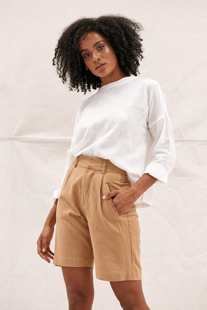 High-waist bermuda shorts with front pleats. Featuring front pockets, rear welt pocket, zip fly and metal hook fastening.